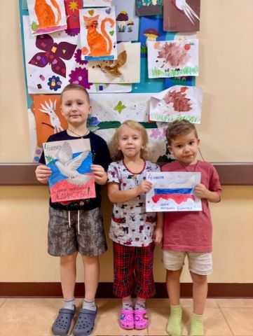 Маленькие пациенты в своих рисунках старались изобразить символы российского государства и мира. Все рисунки были размещены на стендах отделения медицинской реабилитации.