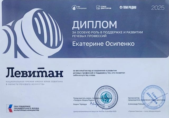 17 декабря 2025 года. В Москве в Центре исполнительского искусства состоялась торжественная церемония вручения Национальной премии Юрия Левитана. Ежегодная престижная Премия в области речевого искусства, призванная способствовать сохранению культуры речи и великого русского языка, проходит при поддержке Союза дикторов и Президентского фонда культурных инициатив с 2018 года. В 2025 году начальник НКО фониатрии Национального медицинского исследовательского центра оториноларингологии ФМБА России, президент Российской ассоциации фониатров и фонопедов, врач-фониатр, к.м.н. Екатерина Осипенко удостоена Национальной премии Юрия Левитана «За особую роль в поддержке и развитии речевых профессий». Поздравляем Екатерину Владимировну с почетной и заслуженной наградой за большой вклад в профессию!