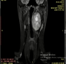 После эндоскопического осмотра в отделении ВДП, пациенту в отделении лучевой диагностики центра было выполнено МРТ исследование области шеи, при котором было выявлено образование размером 7 см х 5 см, располагающееся в парафарингеальной области, (рис. 1, 2)